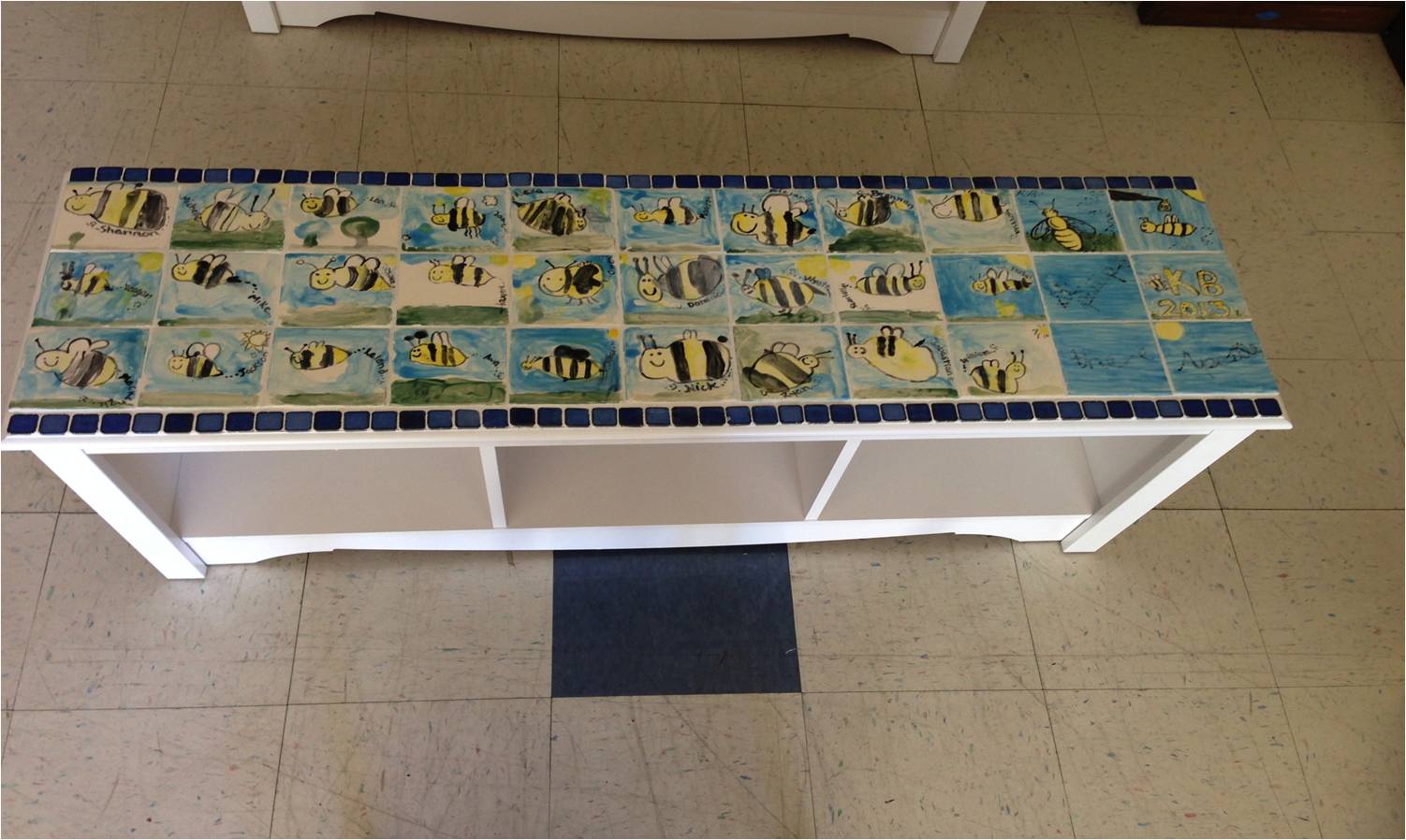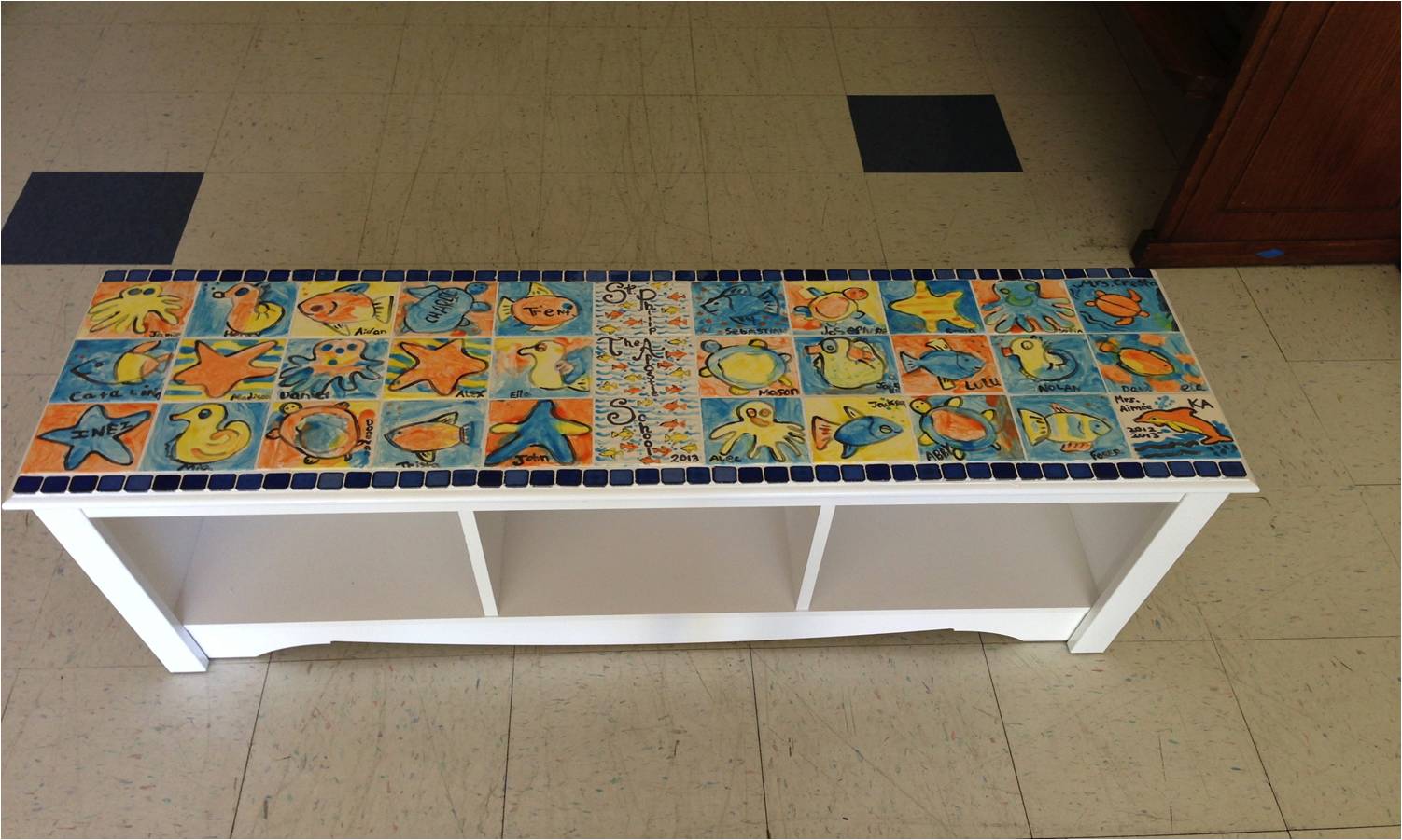 Children from KA - This beautifully hand decorated wood bench will grace your home and be a keepsake for years to come. Each KA student painted an adorable sea creature on the tiles decorating the top of the bench W